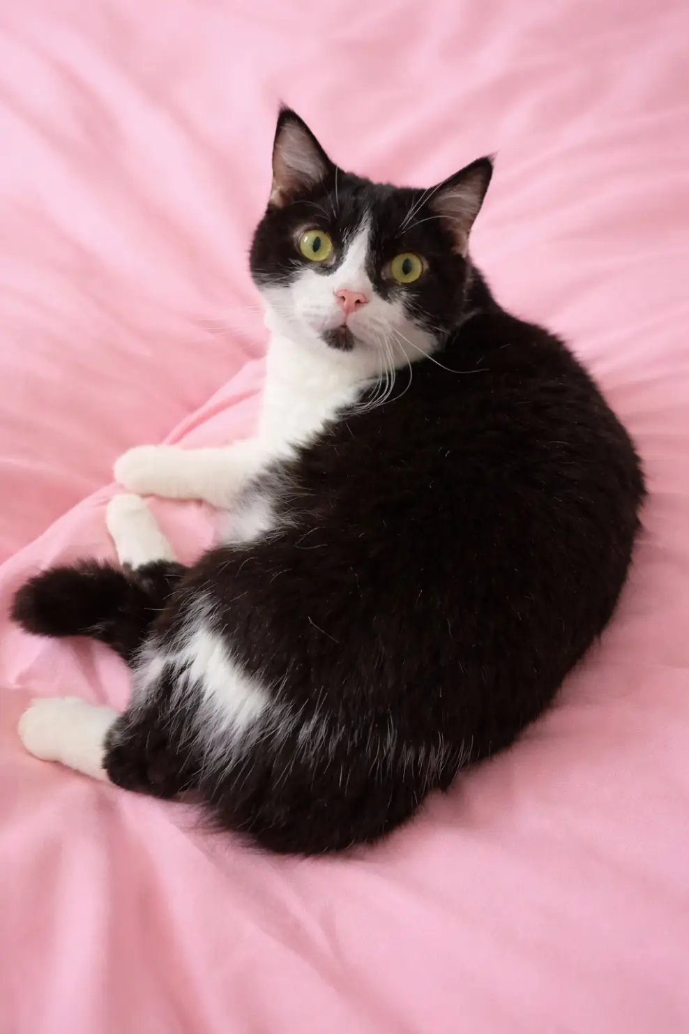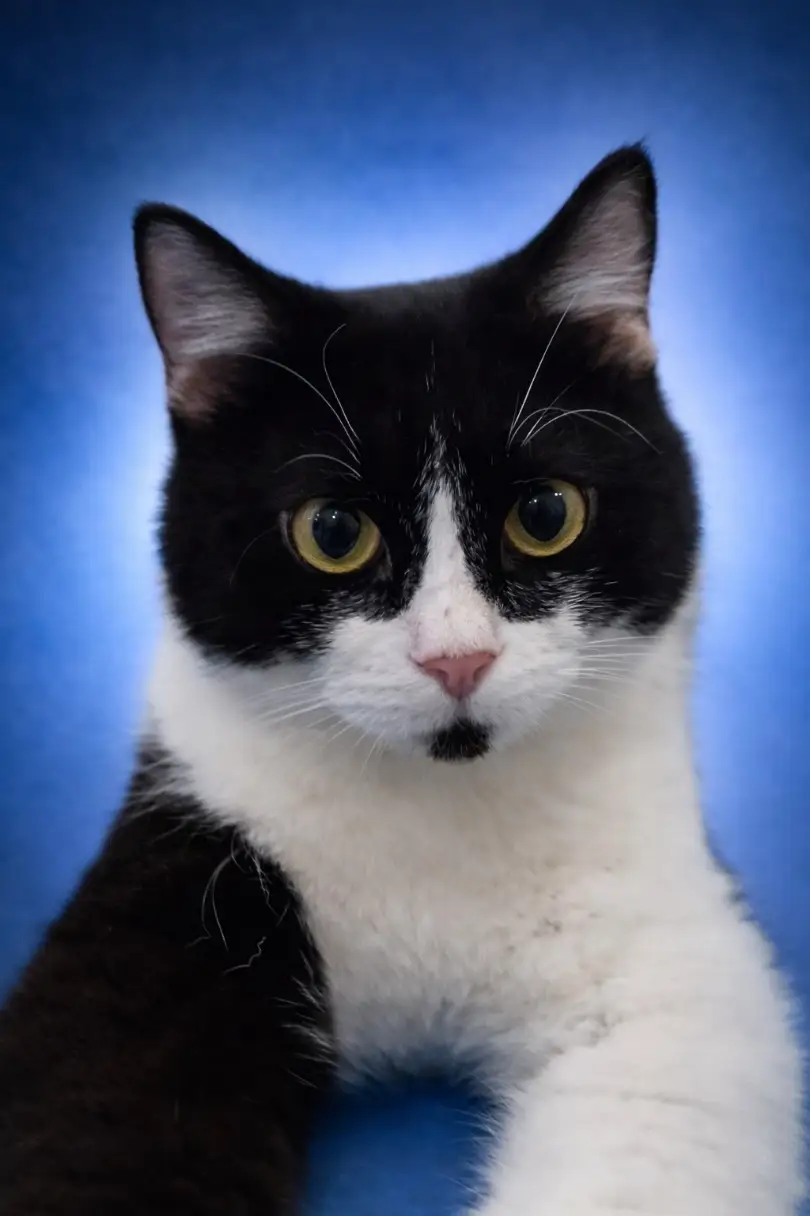 Chester is a large black-and-white tuxedo cat with medium-long fur and a soft, balanced build. He grew into himself quietly — not dramatic, not demanding, but deeply at ease in his own presence.